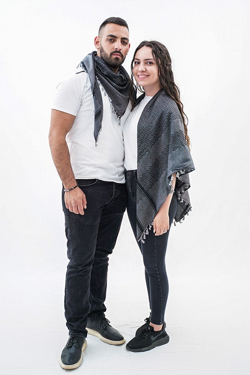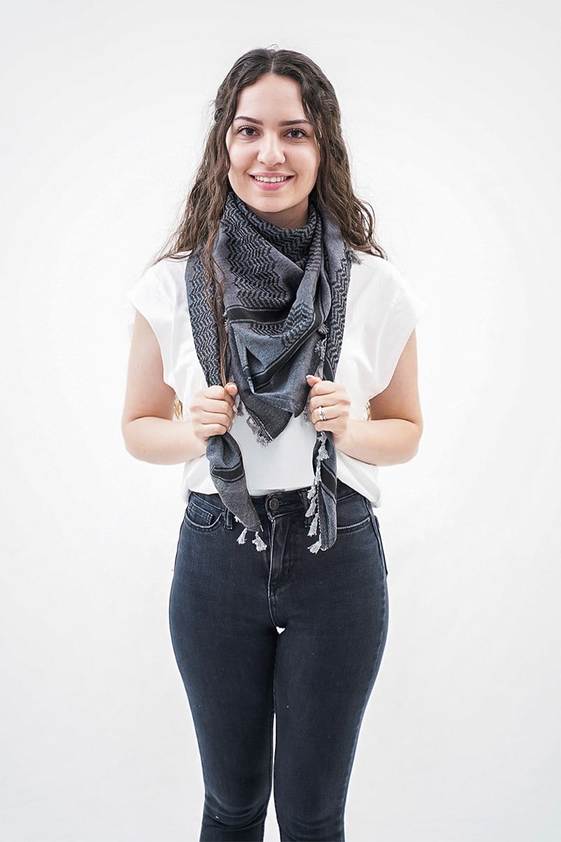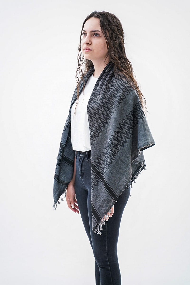 Presenting the Dheisheh Kufiya, a striking fusion of heritage and strength. Crafted in Palestine, this Keffiyeh, also known as a Shemagh, boasts a bold dark gray backdrop, accentuated by a captivating black zigzag pattern and complemented with light gray tassels. Drawing inspiration from the resilient spirit of the Dheisheh refugee camp in Bethlehem, this authentic Kufiya honors the unwavering determination and courage of its people. Despite facing adversity, the residents of Dheisheh embody remarkable resilience, wisdom, and an infectious sense of humor. Embrace their vibrant energy and timeless elegance with this symbolic and dynamic design.